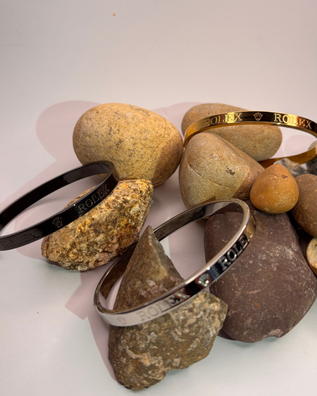Sleek, bold, and timeless — the Luxury Rolex Engraved Bangle is the ultimate accessory for those who value refined sophistication. Available in three stunning finishes — Gold, Silver, and Black, each bangle features the iconic engraved Rolex detailing that adds a touch of prestige to any outfit.